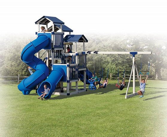 From a speedy trip down the steep slide to sitting high in the tower looking over the yard, tall swings and playsets are a ton of fun! Since taller sets mean faster rides and even more fun climbing, they are a favorite among older kids. The tallest swing sets we build at Adventure World Play Sets have a deck height of nine feet, meaning that the floor of the tallest tower is nine feet off of the ground! In today’s blog, we’re showcasing some of our most popular models and breaking down different swing set height options.