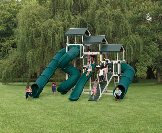 Kids can’t help but marvel when they see the Fantasy Fortress! This set features a nine-foot, a seven-foot, AND a five-foot tower — all connected into one exciting backyard fort. There’s no question your kids will love scaling the gangplank and climbing the towers to look out over their neighborhood. Featuring four slides perfect for races, this sprawling set doesn’t need swings to deliver hours of heart-pumping outdoor enjoyment.
