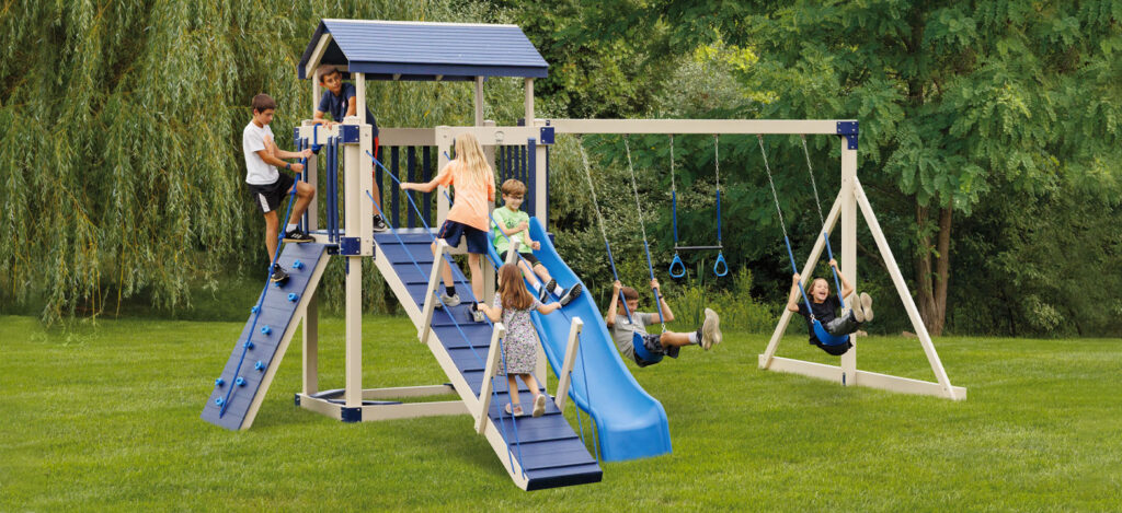 This play set includes two 4×4 5ft high Busy basecamp towers, two rock walls, two entrance laddres, two rubber coated swings and two wonder wave slides double the fun! Augmented Reality visualizer!