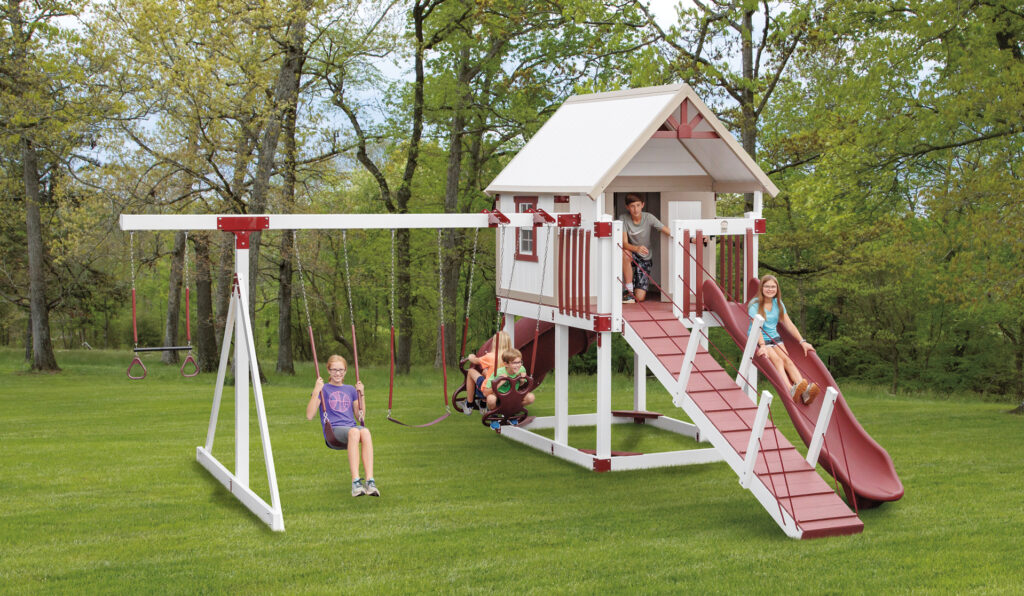 Deluxe playhouse with door, safety windows, front deck, one wavy slide, ladder, swing area, rubber-coated seats, and trapeze/ring combo. Ideal for kids who love playing house. Try it out on your back yard with our Augmented Reality visualizer!